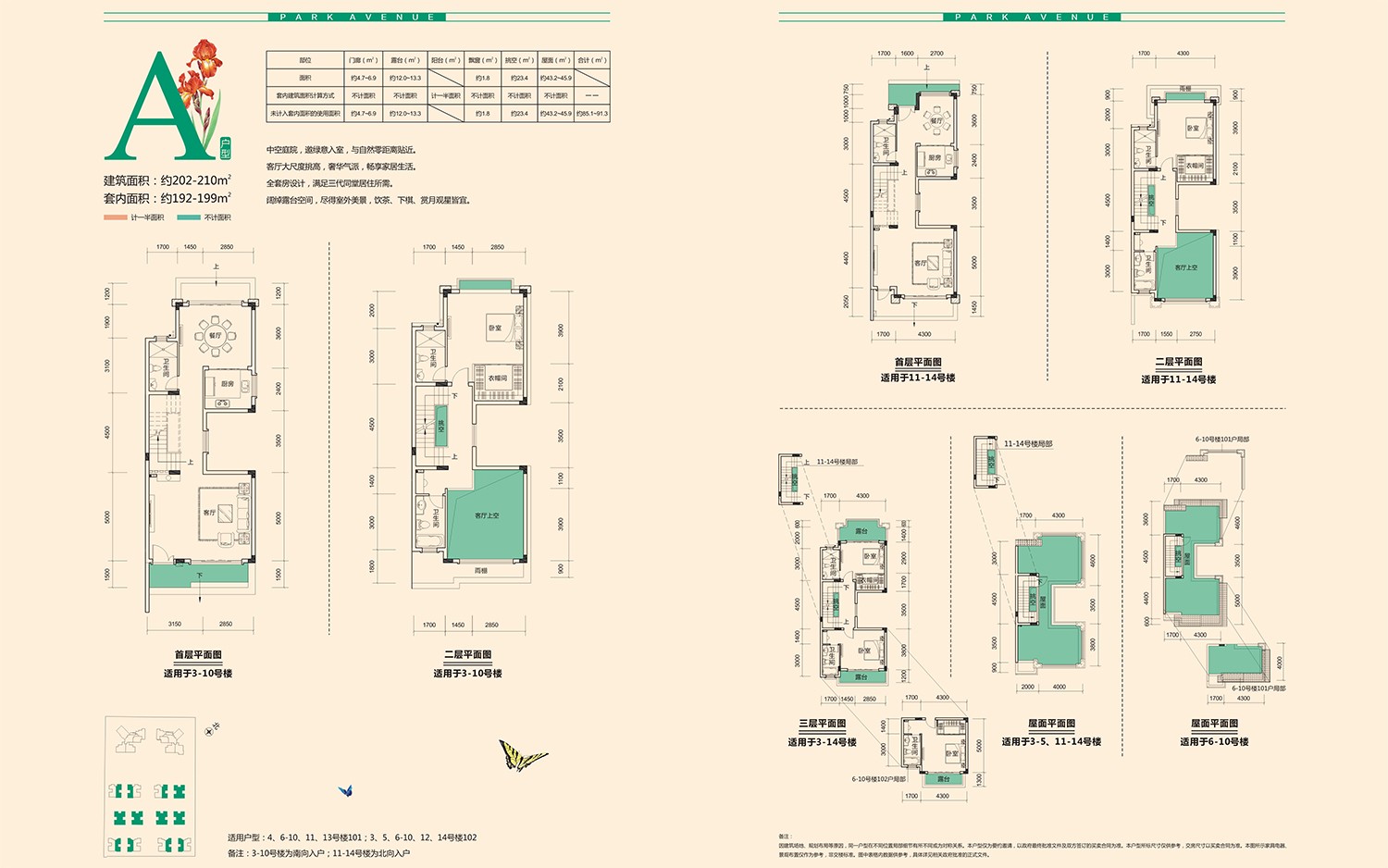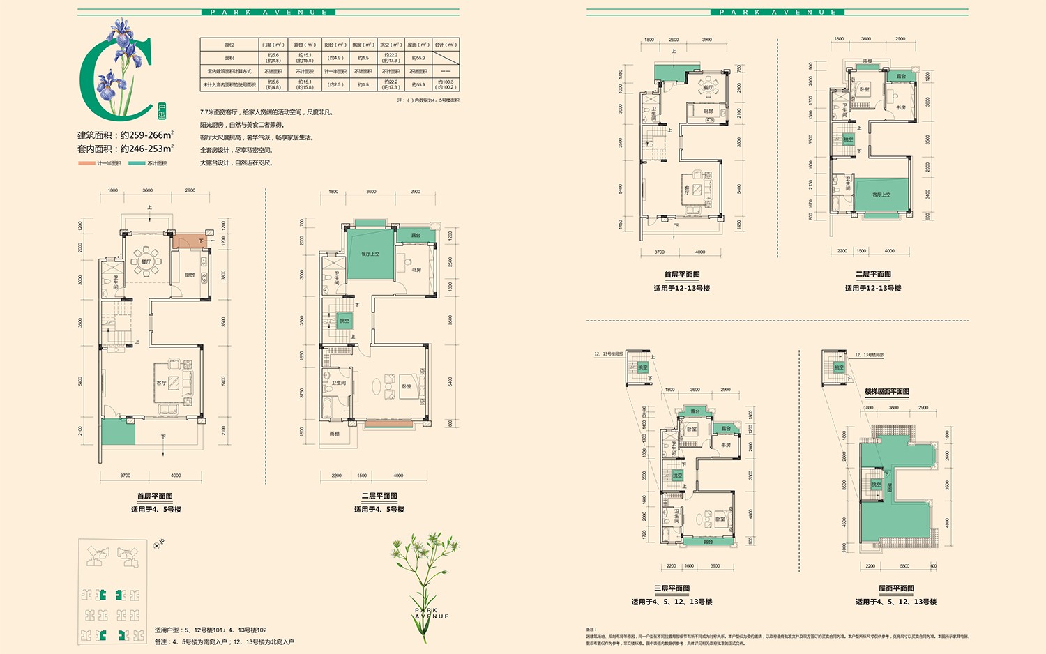 建筑面積:約259-266m2。套內面積:約246-253m2。